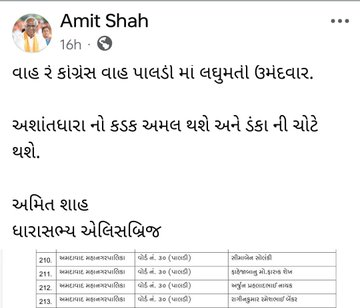 તાજેતરમાં કોંગ્રેસે અમદાવાદ મનપા માટે તેના ઉમેદવારોના નામ જાહેર કર્યા છે. આ યાદીમાં વોર્ડ નંબર-30 (પાલડી) માં લઘુમતી ઉમેદવારને ટિકિટ આપવામાં આવી છે. આ મુદ્દે ધારાસભ્ય અમિત શાહે કટાક્ષ કરતા લખ્યું કે, “વાહ રે કોંગ્રેસ વાહ, પાલડીમાં લઘુમતી ઉમેદવાર.” તેમણે સીધો સંકેત આપ્યો છે કે અશાંતધારા હેઠળ આવતા વિસ્તારોમાં વસ્તીના સમીકરણો બદલવાના પ્રયાસો સામે ભાજપ સજાગ છે.