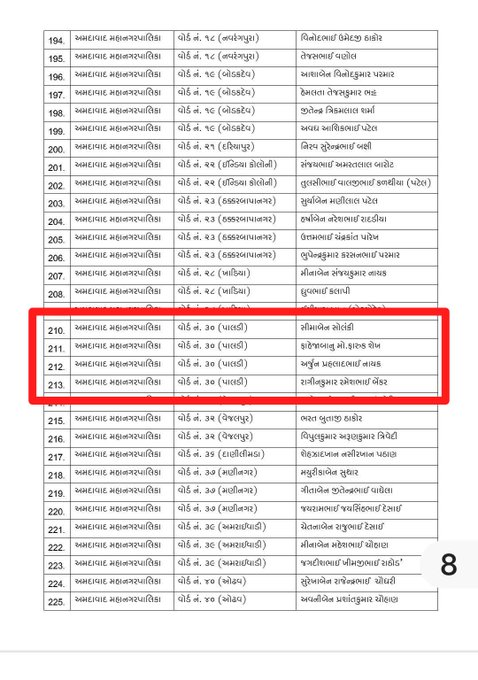 કોંગ્રેસની યાદી મુજબ વોર્ડ નંબર-30 (પાલડી) માં નીચે મુજબના ઉમેદવારો મેદાનમાં છે:
