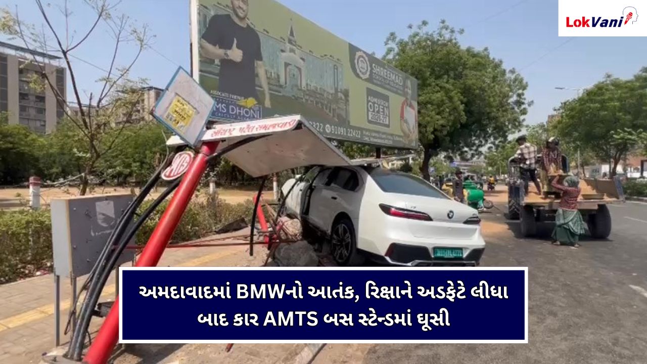 અમદાવાદ: શહેરના નિકોલ વિસ્તારમાં સોમવારે બપોરે એક ભયાનક હિટ એન્ડ રનનો કિસ્સો પ્રકાશમાં આવ્યો છે. નિકોલના ભક્તિ સર્કલ પાસે એક પૂરઝડપે આવતી લક્ઝરી BMW કારે રોડ પર જતી પેસેન્જર રિક્ષાને જોરદાર ટક્કર મારી હતી. અકસ્માત એટલો પ્રચંડ હતો કે રિક્ષા હવામાં ફંગોળાઈને પલટી ખાઈ ગઈ હતી અને કાર કાબુ બહાર જઈ સીધી નજીકના AMTS બસ સ્ટેન્ડમાં ઘૂસી ગઈ હતી.