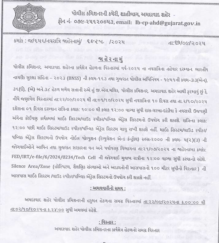 આગામી નવરાત્રીના તહેવારને ધ્યાનમાં રાખીને, અમદાવાદ શહેરના પોલીસ કમિશનર દ્વારા એક જાહેરનામું બહાર પાડવામાં આવ્યું છે. આ જાહેરનામા મુજબ, નવરાત્રી દરમિયાન રાસ-ગરબા-દાંડિયા અને અન્ય ઉજવણીઓ માટે માઈક સિસ્ટમ કે લાઉડસ્પીકર રાત્રિના ૧૨ વાગ્યા પછી ચાલુ રાખી શકાશે નહીં.