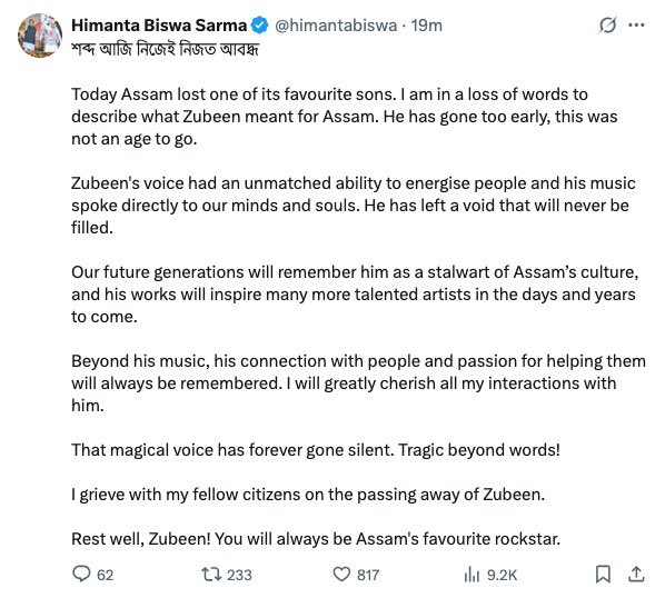 આસામના જાણીતા ગાયક અને લોકપ્રિય કલાકાર ઝુબીન ગર્ગનું સિંગાપોરની એક હોસ્પિટલમાં નિધન થયું છે. તેમના અચાનક અવસાનથી આસામ અને સમગ્ર ઉત્તર-પૂર્વ ભારતમાં શોકની લહેર ફરી વળી છે. મુખ્યમંત્રી હિમંતા બિસ્વા સરમાએ શોક વ્યક્ત કરતા કહ્યું કે આસામે આજે તેના એક પ્રિય પુત્રને ગુમાવ્યો છે, અને તેમના જવાથી એક એવી ખાલી જગ્યા સર્જાઈ છે જે ક્યારેય […]