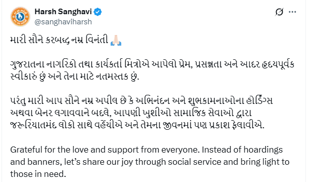 નાયબ મુખ્યમંત્રી હર્ષ સંઘવીએ ટ્વીટ દ્વારા તેમની આ કરબદ્ધ નમ્ર વિનંતી વ્યક્ત કરી હતી. તેમણે લખ્યું હતું કે, “ગુજરાતના નાગરિકો તથા કાર્યકર્તા મિત્રોએ આપેલો પ્રેમ, પ્રસન્નતા અને આદર હૃદયપૂર્વક સ્વીકારું છું અને તેના માટે નતમસ્તક છું.”