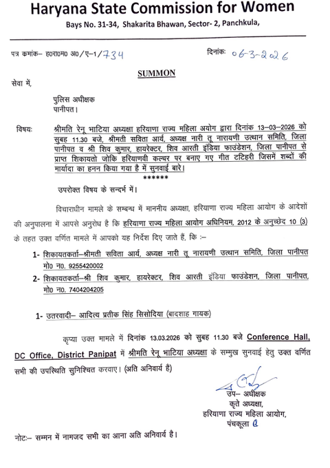 હરિયાણા રાજ્ય મહિલા આયોગના અધ્યક્ષ રેણુ ભાટિયાએ આ મામલે સખત વલણ અપનાવ્યું છે. સવિતા આર્ય (નારી તૂ નારાયણી ઉત્થાન સમિતિ) અને શિવ કુમાર (શિવ આરતી ઇન્ડિયા ફાઉન્ડેશન) દ્વારા નોંધાવવામાં આવેલી ફરિયાદના આધારે આ કાર્યવાહી કરવામાં આવી છે. બાદશાહને ૧૩ માર્ચ ૨૦૨૬ ના રોજ સવારે ૧૧:૩૦ વાગ્યે હાજર થવા જણાવાયું છે. આ સુનાવણી ડીસી ઓફિસ, પાણીપતના કોન્ફરન્સ હોલમાં યોજાશે. હરિયાણા રાજ્ય મહિલા આયોગ અધિનિયમ, ૨૦૧૨ ની કલમ ૧૦(૩) હેઠળ આ સમન્સ જારી કરવામાં આવ્યું છે, જેમાં બાદશાહની હાજરી અનિવાર્ય ગણાવવામાં આવી છે.