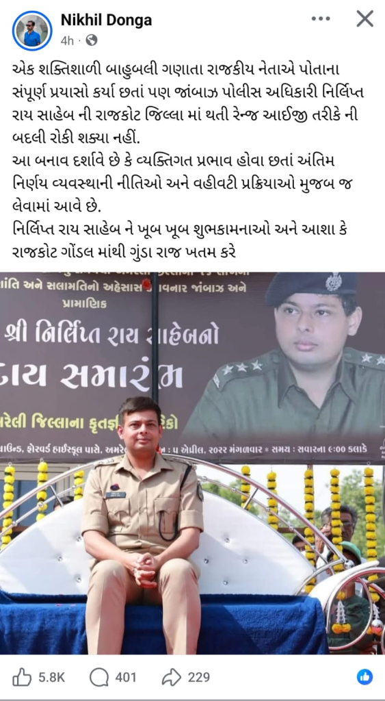 ગોંડલ: રાજકોટ રેન્જ IG તરીકે કડક અને નીડર IPS અધિકારી નિર્લિપ્ત રાયની નિમણૂક થતાની સાથે જ સૌરાષ્ટ્રના રાજકારણમાં હલચલ મચી ગઈ છે. આ નિમણૂકને લઈને ગોંડલના ચર્ચિત શખ્સ નિખિલ દોંગાએ સોશિયલ મીડિયા પર એક ફેસબુક પોસ્ટ કરી છે, જેણે ગોંડલ અને રાજકોટના રાજકીય વર્તુળોમાં ભારે ચર્ચા જગાવી છે. નિખિલ દોંગાએ પોતાની પોસ્ટમાં નિર્લિપ્ત રાયને શુભેચ્છા પાઠવી છે અને આશા વ્યક્ત કરી છે કે તેમના આવવાથી રાજકોટ અને ગોંડલમાંથી ‘ગુંડારાજ’નો અંત આવશે.