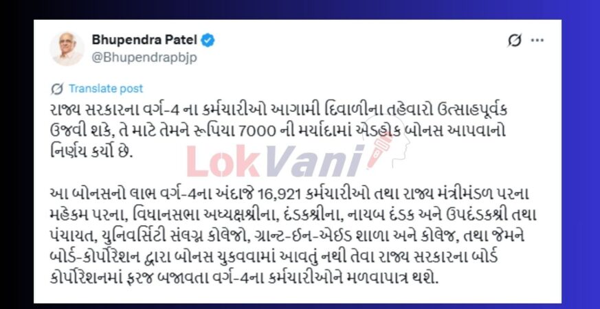 દિવાળી પહેલાં CM ભૂપેન્દ્ર પટેલની મોટી જાહેરાત: વર્ગ-૪ના કર્મચારીઓને એડહોક બોનસ મળશે