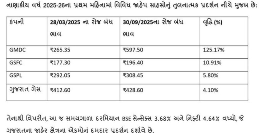 અમદાવાદ: ગુજરાતના જાહેર ક્ષેત્રના ઉપક્રમો (PSUs), જેમને ‘ગુજરાતના રત્નો’ તરીકે ઓળખવામાં આવે છે, તેમણે નાણાકીય વર્ષ ૨૦૨૫-૨૬ના પ્રથમ છ મહિનામાં શેરબજારમાં અસાધારણ પ્રદર્શન કર્યું છે. આ PSU’s એ માત્ર સકારાત્મક વૃદ્ધિ જ નથી નોંધાવી, પરંતુ દેશના મુખ્ય ઇન્ડેક્સ BSE સેન્સેક્સ અને નિફ્ટીને પણ પ્રદર્શનની દૃષ્ટિએ પાછળ છોડી દીધા છે. પ્રાપ્ત ડેટા અનુસાર, ગુજરાત સ્ટેટ ફર્ટિલાઇઝર્સ […]