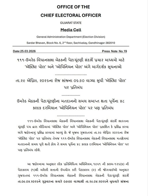 મુખ્ય નિર્વાચન અધિકારીની કચેરી દ્વારા પ્રેસ નોટ જાહેર કરીને મીડિયા માધ્યમો માટે માર્ગદર્શક સૂચનાઓ બહાર પાડવામાં આવી છે. લોક પ્રતિનિધિત્વ અધિનિયમ, ૧૯૫૧ની કલમ-૧૨૬(ક) મુજબ, તા. ૦૯.૦૪.૨૦૨૬ના ગુરુવાર સવારના ૦૭:૦૦ વાગ્યાથી તા. ૨૯.૦૪.૨૦૨૬ના બુધવાર સાંજના ૦૬:૩૦ વાગ્યા સુધી કોઈ પણ પ્રકારના ‘એક્ઝિટ પોલ’ના પરિણામો પ્રકાશિત કરવા પર પ્રતિબંધ છે. આ ઉપરાંત, મતદાનના ૪૮ કલાક પૂર્વે ‘ઓપિનિયન પોલ’ કે અન્ય કોઈ પણ સર્વેક્ષણ પ્રદર્શિત કરવા પર પણ મનાઈ ફરમાવવામાં આવી છે. આ જોગવાઈઓનો ભંગ કરનારને ૨ વર્ષ સુધીની જેલ અથવા દંડની સજા થઈ શકે છે.